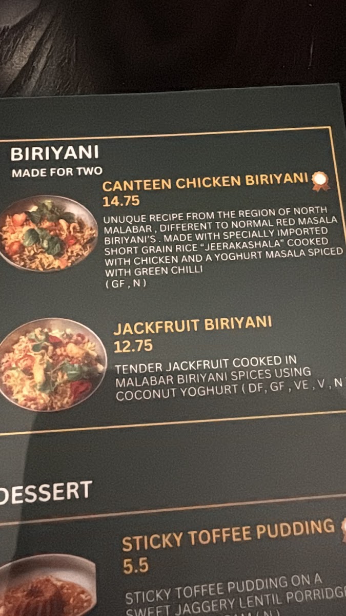 Welcome to Kerala Canteen, a modern South Indian tapas-style restaurant and bar located in the heart of Leeds. Here, each dish is crafted to celebrate the rich culinary heritage of Kerala. The menu highlights featured dishes such as the Kovalam Beef Brisket Biriyani, renowned for its aromatic, slow-cooked flavors, and the unique Canteen Chicken Biriyani from North Malabar.